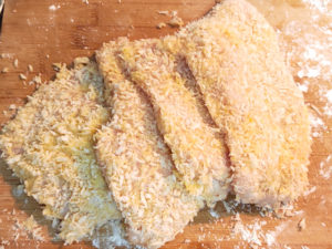 ![]() 2:切った鶏肉に、薄力粉→衣用卵(溶いたもの)→パン粉の順に衣をつけましょう。 |