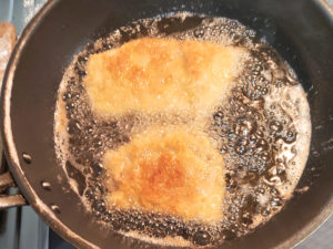 ![]() 3:180~190度の油で、きつね色(片面3分ずつくらい)になるまで揚げます。 |