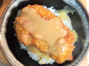 ![]() 8:丼にご飯を盛りつけ、たっぷりの味噌ソースを乗せたら、上に食べやすくカットしたカツを乗せ、さらにカツの上にもソースをかけます。 |