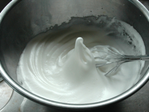 ![]() ①卵白と卵黄をボールに分けて入れ、砂糖も半量ずつくらいに分けます。 ②砂糖ひとつまみを入れて卵白を泡立て始め、途中二回に分けて砂糖を加えて、ピンと角が立つまで泡立てましょう。 |