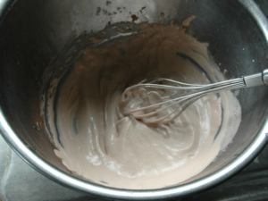 ![]() ケーキを冷ましている間に、クリームを作りましょう。 ⑫ボールに生クリーム120ccとココア、砂糖を加え、8分立てくらいの固さにして、冷蔵庫で冷やしておきます。 |