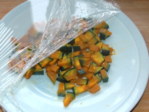 ![]() ⑮南瓜の甘煮は、南瓜を8mm角くらいに小さく切り、ラップをしてレンジで3分加熱します。 (こちらは皮がついたまま) |