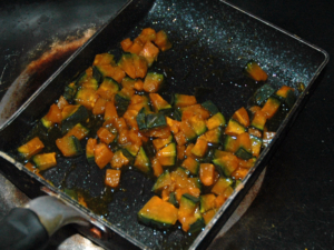 ![]() ⑯フライパンに砂糖大2と水大1を加えて煮詰め、そこに南瓜を絡めましょう。 |