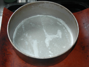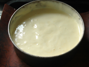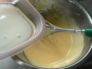 ![]() ④牛乳とサラダ油を一緒に、ラップをかけないで、レンジで30秒温め、人肌の温度にしてから、卵黄のボールに少しずつ加えていきます。 ⑤その都度良く混ぜ合わせましょう。 |