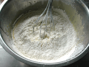 ![]() ⑥粉を全量ふるい入れ、粉っぽさがなくなるまで、しっかりと混ぜましょう。 |