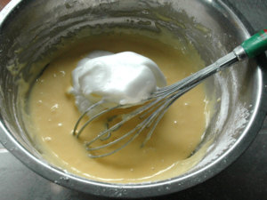 ![]() ⑦卵黄のボールにメレンゲを少量入れ、良く混ぜ合わせます。 |