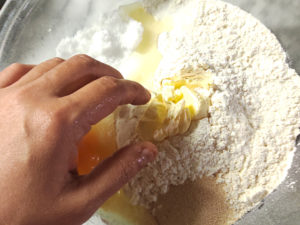 ![]() 1:大きめのボールに、強力粉、卵、パン生地用のマーガリン、イースト、上白糖、塩(イーストの反対側に)を入れ、手で卵を切り崩すように混ぜます。 |