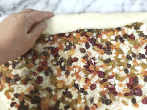 ![]() 11:ドライミックスフルーツを全体に散らし、手で軽く押さえ込むようにします。 (ママパンのドライミックスフルーツを使いました。) |