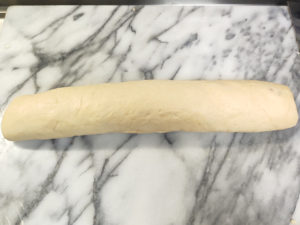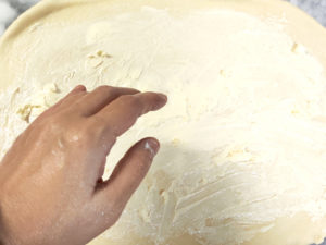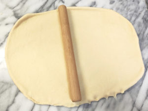 ![]() 8:生地を強力粉(分量外)を少々振った台の上に取り出し、麺棒で長方形になるように伸ばしましょう。 |