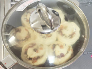 ![]() 16:オールパンゼロクリア(サイズは26cm)に生地を敷き詰め、蓋をして、IHコンロなら最小の1に合わせて焼き始めましょう。 17:途中12分ほど経ったら、一旦火を止め、上蓋の水分を拭き取ります。 18:さらに8~10分ほど同じように最小の火加減で焼きましょう。 (糖分が多いので焦げ付きやすいため、IHもガスも弱火に設定してください。) |