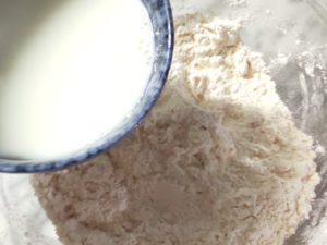![]() 2:ぬるめの牛乳を3回ほどに分けて加え、その都度手でこねましょう。 (多少べたつく程度まででOK。) 3:台の上に生地を取り出し、生地を10分間捏ねて、表面が滑らかになればOK。 |