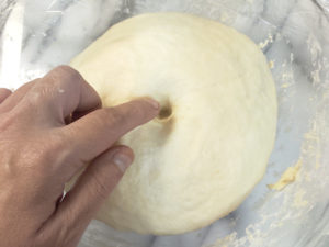 ![]() 6:生地の中央に指で穴をあけてみて、戻らないようなら一次発酵はOK。 7:手の甲でパンチするようにして、ガス抜きをします。 |