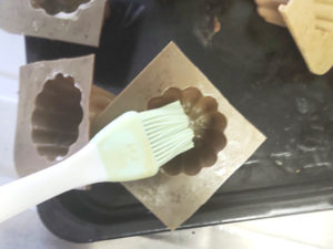 1:マーガリン大1/2ほど(分量外)をレンジで溶かし、刷毛でカヌレ型の内側を塗っておき、塗り終えたら、使うまで冷蔵庫に入れます。