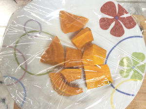 3:南瓜を大きめの一口大に切り、皮を切り落とし、一旦水にくぐらせたら、耐熱皿に乗せ、ラップをしてレンジで5分加熱します。