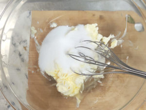 4:マーガリンが入っている耐熱ボールにグラニュー糖を加え、白っぽくふわふわするまですり混ぜましょう。