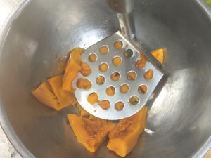 6:南瓜が柔らかくなったら、別のボールに取り出し、マッシャーで細かくつぶしましょう。