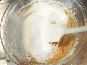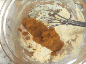 8:マーガリンの入ったボールに、南瓜を2~3回に分けて加え、その都度よく混ぜます。