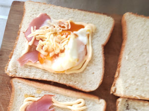 ![]() 4:食パンに大1/2のマヨネーズを四角く絞り、囲いの中に温泉卵1個とチーズを大1ずつ、半分に切ったベーコンを乗せます。 5:枚数分用意しましょう。 |