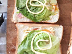 ![]() 6:1枚にサラダ菜1枚くらいを乗せ、残りのマヨネーズは適当に絞ります。 7:こちらも枚数分繰り返したら、スライスしたパンを乗せて軽く押さえてサンドしましょう。 |