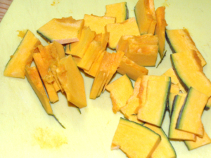 ![]() ①南瓜は皮つきで、5~7mm幅に切り、ラップをして、レンジで3~4分加熱します。 |