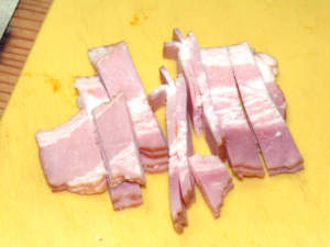 ![]() ②ベーコンも5~7mm幅に切ります。 |