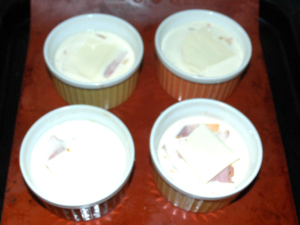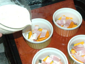 ![]() ④ココットに南瓜とベーコンを入れ、混ぜておいた牛乳液を等分に流し入れます。 |