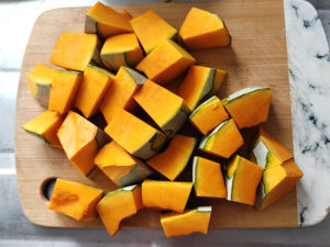 ![]() 1:南瓜は種とワタを取り、少し大きめの一口大に切ります。 (皮はまだらに残る程度にむきます。) |