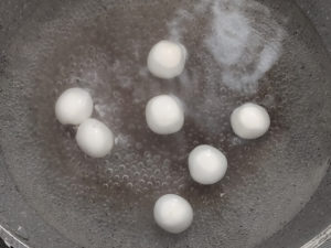 ![]() 6:小鍋にお湯を沸かし、8等分くらいに丸めた白玉団子を入れて、4~5分ゆでましょう。 7:すぐに、冷水の入ったボールに入れて冷ましておきます。 |