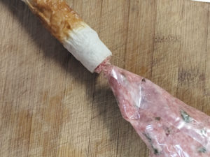 ![]() 2:ポリ袋か絞り袋などにひき肉を入れ、先端を切って、絞り出せるようにしましょう。 (ポリ袋がなかったので絞り袋を使いましたが、柔らかい分ポリ袋の方がうまくいくと思います。) |