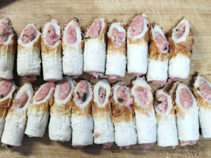 ![]() 4:ひき肉を詰め終わったら、斜め半分にカットしましょう。 |