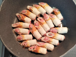![]() 6:竹輪をひっくり返したら、蓋をして、弱火で3分ほど焼き、肉の色が白くなっていればOK。 |