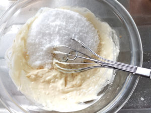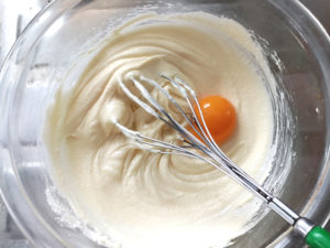 ![]() 3:卵黄とバニラエッセンスもボールに加え、全体になじむまでよく混ぜます。 |