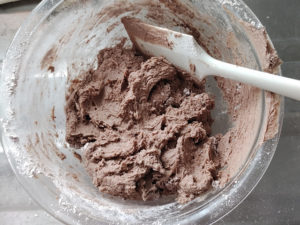 ![]() 4:薄力粉とココアを一緒にふるったものをボールに2回に分けて加え、その都度ゴムベラで練らないように混ぜましょう。 |