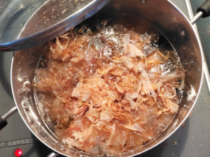 ![]() 2:昆布の入った鍋に鰹節を入れ、火を強めて中火にかけましょう。 3:沸騰したら、弱火にし、2分ほどゆでたらOK。 |