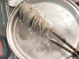 ![]() 6:別の大きめの鍋にたっぷりのお湯を沸かし、乾麺の蕎麦をパッケージの時間通りにゆでます。 |