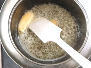 ![]() 3:小鍋にバターを加えて弱火にかけ、焦がしバターを作ります。 4:小さ目のボールに氷水を用意しておきましょう。 |