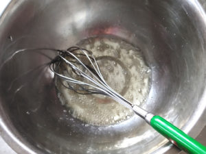 ![]() 8:砂糖もボールに加え、ここも泡立てないように、泡立て器を垂直に構え、砂糖の粒が見えなくなるくらいまでぐるぐると混ぜましょう。 |