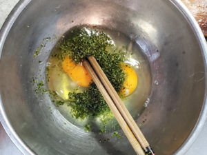![]() 3:ボールに卵と青のりを入れ、良く溶いて溶き卵を作ります。 |