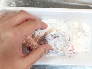 ![]() 4:豚肉の全面に薄く薄力粉を、まんべんなくまぶしましょう。 |