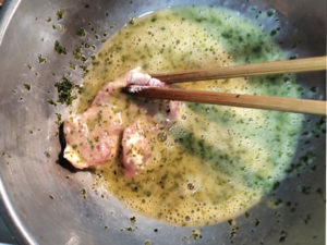 ![]() 5:フライパンに油を引いて火にかけ、手をかざして熱くなったら、豚肉を溶き卵にくぐらせて、衣をつけ、フライパンに重ならないように並べます。 |
