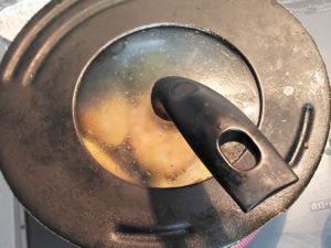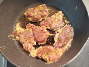 豚肉にしっかりと火を通さないと危険なので、蓋をした後も焼き色を付ける時にも、少し強めに火を通してください。