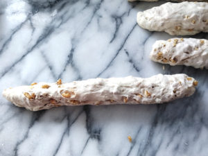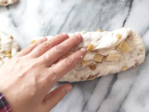 ![]() 5:刻んだクルミもボールに加え、手でおしつけるようにしながら、全体にクルミが散るように捏ねます。 |
