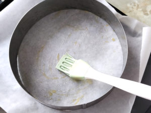 ![]() 14:天板の上にクッキングシートを敷き、型を乗せたら、底面と側面にオリーブオイルを刷毛で塗りましょう。 (底取れのケーキ型がなかったため、セルクルの21cmタイプを使っています。) |