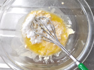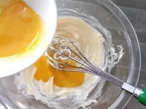 ![]() 3:タルト生地の卵を少しずつ加え、その都度良く混ぜます。 |
