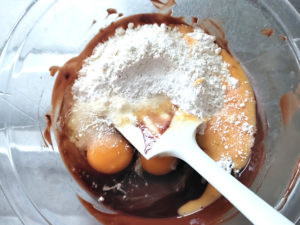 ![]() 17:チョコが完全に溶けたら、中力粉、上白糖、卵(生地で余った卵も加えます。)を加えて混ぜ、全体がなめらかになればOK。 |