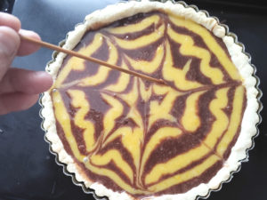![]() 20:生地の中に、まずチョコフィリングを高さ8分目くらいまで流し入れ、ホワイトチョコを絞り袋に入れて、同心円状に4本ほど絞ります。 21:竹串で中央から外側に引っ張るようにして模様をつけましょう。 |