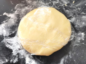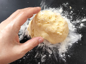 ![]() 6:粉っぽさがなくなったら、手で球形に丸め、その後平たい円状にしましょう。 7:ラップをして、冷蔵庫で30分以上しっかりと冷やします。 |