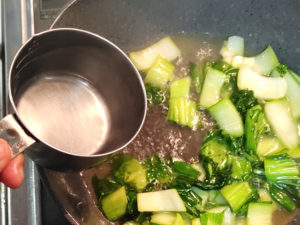 ![]() 3:チンゲン菜に油が回ったら、お湯を一気に加え、再度沸騰させます。 |