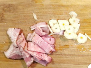 ![]() 5:ベーコンは8mm幅に、にんにくは皮をむいて薄切りにします。 |