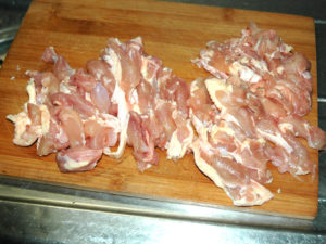 ![]() 1:鶏肉は火が通りやすいように、出来るだけ細く切ります。 |